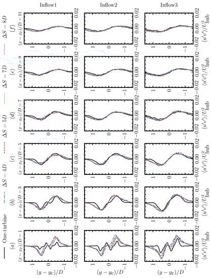 Spanwise profiles of the Reynolds stress downwind of the second turbine of the two-turbine cases and downwind of the stand-alone turbine at (a) 1, (b) 3, (c) 5, (d) 7, (e) 9, (f) 11.
