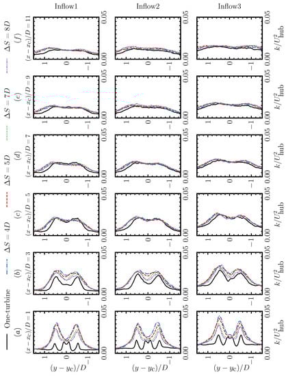 Spanwise profiles of the turbulence kinetic energy downwind of the second turbine of the two-turbine cases and downwind of the stand-alone turbine at (a) 1, (b) 3, (c) 5, (d) 7, (e) 9, (f) 11.