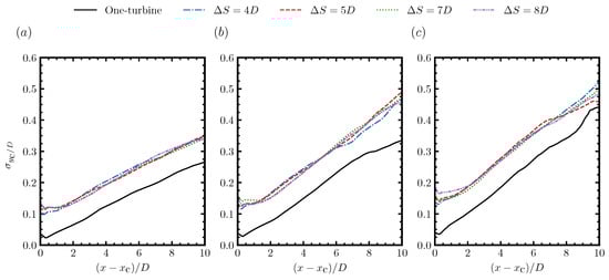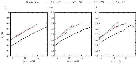 Streamwise variations of the half width of the time-averaged wake, which is obtained by fitting the time-averaged velocity deficit using the Gaussian distribution, for (a) inflow1, (b) inflow2, and (c) inflow3, respectively.
