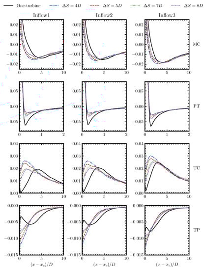 Comparison of the MC, PT, TC and TP terms in the wake of the waked turbine of the two-turbine cases with the stand-alone turbine for different turbine spacings and different inflows. Different terms are normalized using and D.