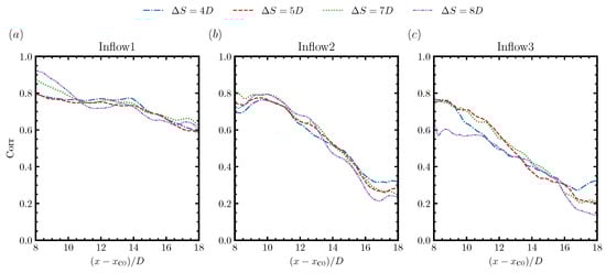 We have seen that the streamwise variations of from the cases with different turbine spacings were fairly similar with each other for the same inflow. In the following, we examine how the instantaneous spanwise wake center of the waked wind turbine is correlated with that of the stand-alone wind turbine at the same streamwise locations in Figure 14. Since the horizontal coordinate was set with respect to the streamwise location of the first turbine (the same with that of the stand-alone wind turbine), would be the downwind of the second wind turbine for , and be the position of the second wind turbine for , respectively. It was seen that the correlations of the instantaneous spanwise wake centers of the waked turbine with the stand-alone wind turbine were very similar with each other for different turbine spacings, when the inflow was the same. For the inflow1 cases, the correlation stayed higher than approximately 0.75 for , and gradually decreased to approximately 0.6 at . For the inflow2 cases, the region with high correlations became shorter, ending at , and gradually decreasing to approximately 0.2 at . For the inflow3 cases, the correlation started to decrease from , and decreased to 0.2 at , except for , which stayed fairly the same in its near wake until .