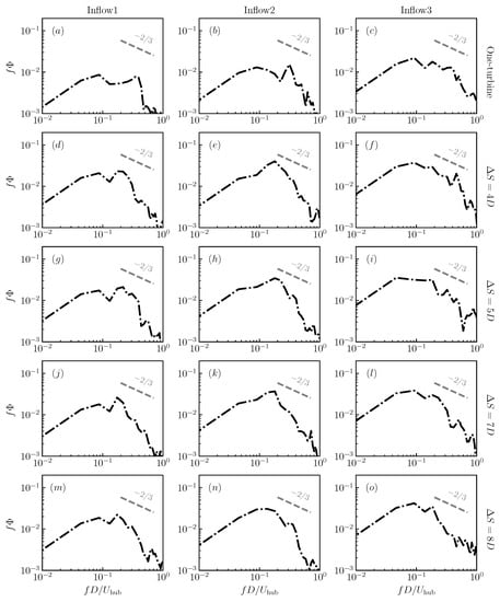 The power spectral density (PSD) of the instantaneous wake positions in the spanwise direction is shown in Figure 15. Overall, it was observed that the most energetic meandering motions happened with the Strouhal number in the range of . For the cases under inflow1, the motion with the maximum energy was observed around , with the other peak located around for the stand-alone wind turbine. For the waked turbines under inflow1, the peak of PSD located around persisted, while the highest peak was found near for all the considered turbine spacings. For the stand-alone wind turbine under inflow2, two noticeable peaks were observed near and , respectively. For the waked turbine with , , , one dominant peak was observed near , which is close to for the case with . For the cases under inflow3, the most dominant peak of PSD was observed near , with the second dominant peak observed close to . In general, the results show that the dominant meandering frequencies from waked turbines with different turbine spacings were fairly similar with each other. Certain differences were observed between the stand-alone turbine and the waked turbine under the same inflow. The peak frequencies changed with inflows, but still fell into a similar range, i.e., . As for the PSD magnitude, it increased with the increase of the inflow turbulence intensity for the stand-alone wind turbine cases. For the cases under the same inflow, the PSD magnitude from the waked wind turbine was significantly higher than that of the stand-alone wind turbine. With the change of turbine spacings, the PSD magnitudes were fairly the same with each other.