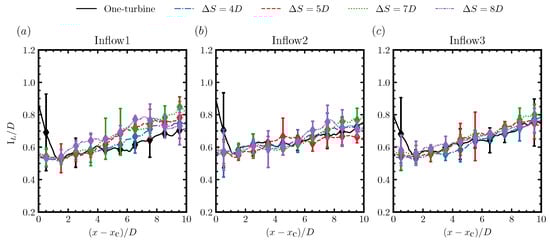 The integral length scales computed based on the above approach are shown in Figure 16. First, it was observed that in the near wake, the length scale of the stand-alone wind turbine behaved significantly different with the waked turbine, where the hub vortex in the wake of the nacelle dominates, which, however, quickly broke down for the waked turbine as a result of the oncoming wake turbulence. Downwind of this near-wake region, the integral length scale gradually increased with distance from the turbine. Overall, the integral length scales from cases with different downwind spacings were close to each other and similar to that from the corresponding stand-alone turbine. For the cases under inflow1, the integral length scales at far wake locations were more scattered, and became less scattered when the inflow was changed from inflow1 to inflow2 and inflow3.