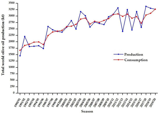 Trend of world consumption and production of olive oil from 1990 to 2020 [1,2].