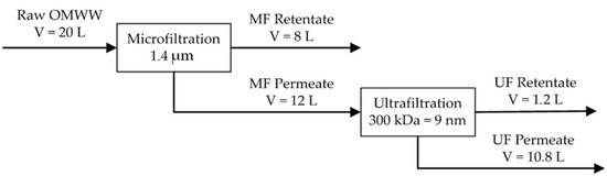 Batch runs were performed, recirculating the retentate until the desired separation targets were reached. A first attempt, adopting a single MF step was not satisfactory in terms of organic matter concentration, and a double step treatment, shown in Figure 2, was preferred. It consisted of a microfiltration step (pore size 1.4 μm) reducing the permeate volume to 60% of the original OMW feed volume, followed by an ultrafiltration step (300 kDa, equal to a pore size of 9 nm) of the obtained permeate.