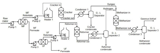 This work analyzes the technical feasibility of the conversion of the organic compounds of OMW into valuable gaseous products by thermal conversion. Membrane separation experiments were performed on a sample of OMW to define the operating sequence and characterize the obtained permeate and retentate streams. This information was used to determine the characteristics of the feed to the conversion process, where syngas is obtained by cracking and steam reforming reactions. A final methanation step was adopted to reduce the carbon dioxide and increase the methane concentration of the gaseous biofuel. Operating conditions of the main equipment, heat, and mass balances were determined by means of process simulation software.