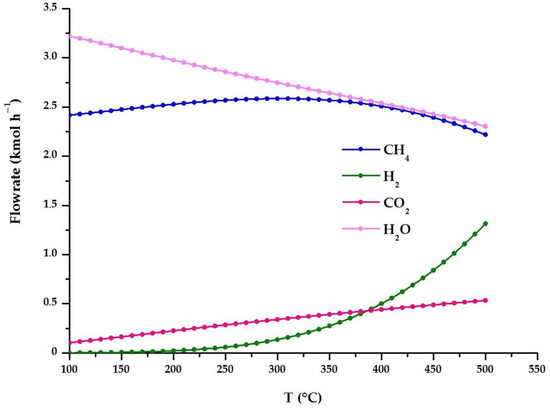 Focusing the attention again on the original scheme of Figure 3, the final composition of the biofuel gas greatly depends on the operating conditions adopted in the methanation reactor. Figure 4 shows the trends of methane, hydrogen, carbon dioxide, and water concentration in the reactor vs. the temperature, as obtained from the process simulator.