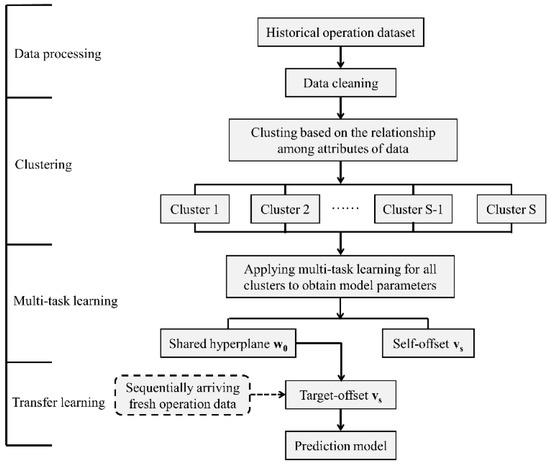 The framework of dynamic cutterhead torque prediction proposed in this paper draws inspiration from various machine learning methods, including clustering, MTL, and transfer learning. The overall framework of the TRLS-SVR mainly consists of four components, namely data pre-processing, dividing of typical working modes based on unsupervised clustering algorithm, extracting implicit common knowledge by MTL algorithm, and knowledge reuse based on transfer learning, as described in Figure 3. In the first step, a large number of historical datum that have a long-time span with current sample are extracted from the database. In the second step, a clustering algorithm was used to effectively divide working modes in the historical dataset according to the relationship among attributes. Next, the MTL paradigm was used to exploit representative knowledge from multiple working modes. Based on the transfer learning paradigm, experiences extracted from the historical dataset were retained and utilized to train a fresh model. The detailed descriptions of each component are introduced below.