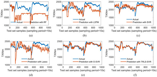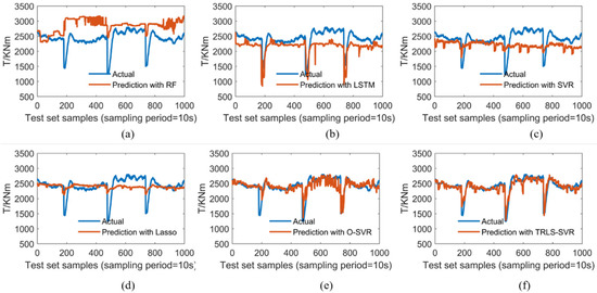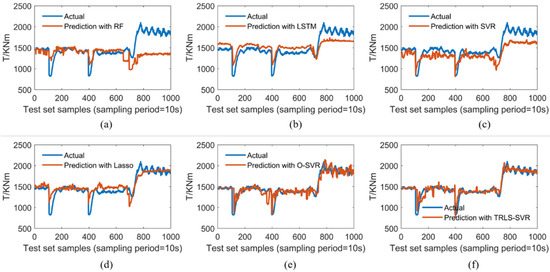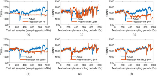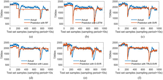 Comparisons between real and predicted cutterhead torque for dataset 5. (a) Prediction result of RF. (b) Prediction result of LSTM. (c) Prediction result of SVR. (d) Prediction result of Lasso. (e) Prediction result of OSVR. (f) Prediction result of TRLS-SVR.