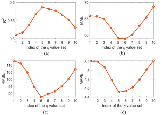 Sensitivity analysis on the regularization parameter, η. (a) R2. (b) MAE. (c) RMSE. (d) MAPE.