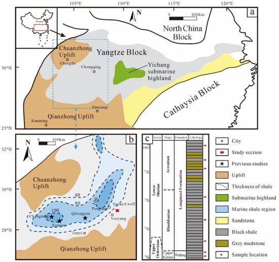 The Sichuan Basin is an NNE-trending rhombus-shaped basin in the northwestern margin of the Yangtze Platform, and is surrounded by mountains (Figure 1a). Starting during the period from the Paleozoic to the Cenozoic, the Sichuan Basin evolved from a craton to a foreland basin through diverse processes, and then to a superimposed marine-continental basin [26]. From Late Ordovician to Early Silurian, two global transgressions produced low-energy and anoxic environments across the basin, and black shales of the WF-LMX were deposited [27] (Figure 1b).