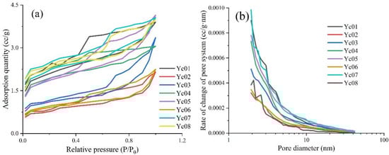 Evidently, the low-pressure N2 adsorption–desorption characteristics of the shales from the WF-LMX Formation were similar. In the low relative pressure section (P/P0 < 0.40), the adsorption was obvious, while in the intermediate relative pressure section (0.4 < P/P0 < 0.9), a hysteresis loop associated with the adsorption–desorption was evident for the samples. However, in the high relative pressure section (P/P0 > 0.9), a significant upward trend was observed for the samples (Figure 3a). The N2 adsorption isotherms of the eight samples were generally inverse ‘S’ type, which is closest to type IV with adsorption steps in the IUPAC isothermal adsorption line classification standard [36]. The overall shape of the hysteresis loops was similar, but the degree of development was different. The higher the TOC content, the greater the hysteresis loop. According to the classification of hysteresis by IUPAC, the pore types of shale samples in the LMX Formation were mainly tabular pores, and the shale samples in the WF Formation were mainly cylindrical and inkbottle pores. Furthermore, the low-pressure N2 adsorption isotherms of the samples revealed that the shale samples from the WF-LMX Formation contained micropores (<2 nm), mesopores (2–50 nm), and macropores (>50 nm).