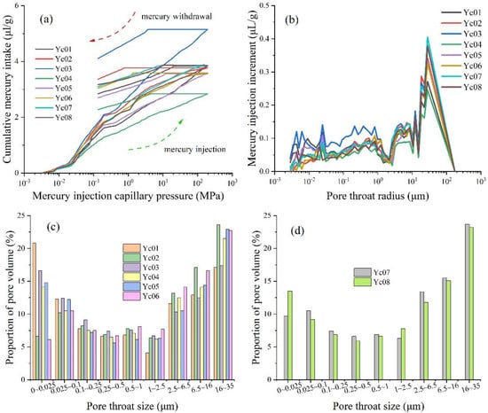 Plots illustrating (a) the high-pressure mercury injection responses, (b) pore throat radium and (c,d) pore size distribution ranges for shales from the WF-LMX Formation.
