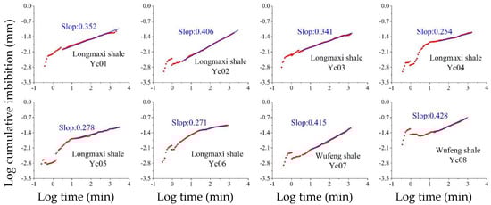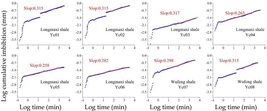 Log plot of the cumulative imbibition of water for shale samples from the Longmaxi and Wufeng Formations.