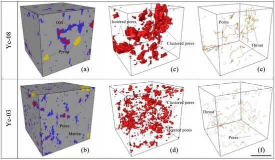 In the analysis of pore connectivity, the gray absorption coefficient difference of X-rays is frequently used to identify fractures, OM, and matrix minerals such as pyrite. These components are commonly assigned the red, blue, gray, and yellow colors, respectively [39]. This approach was adopted to reconstruct and examine the 3D structural characteristics of the Yc-08 (WF Formation) and Yc-03 (LMX Formation) samples (Figure 7a,b), and the associated pore structures were highlighted (Figure 7c,d). To characterize the pore connectivity, a pore network model was constructed using a sphere, an orange-red cylinder, an orange cylinder, and a white cylinder to represent spheres and small, medium, and large throats, respectively (Figure 7e,f). Importantly, X-ray mainly uses the pixel number to distinguish the size of the material composition. The connected small pixels are identified as a large set of pixels. Therefore, the connected pores will be identified as macropore aggregates. This technology has been applied to the study of WF-LMX Formation shale in the same basin [24,39].