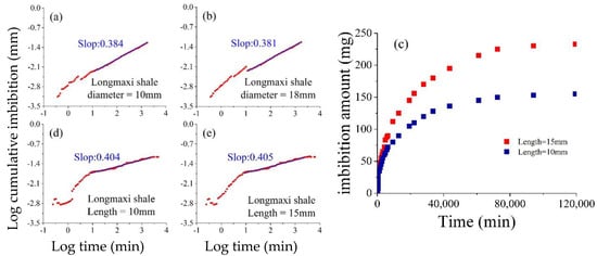 Log cumulative water imbibition versus log imbibition time for the different diameter and length shale samples. Samples of (a) 10 mm and (b) 18 mm in diameter for cumulative imbibition. Samples of (c) 10 mm and 15 mm in length for imbibition amount. Samples of (d) 10 mm and (e) 15 mm in length for cumulative imbibition.