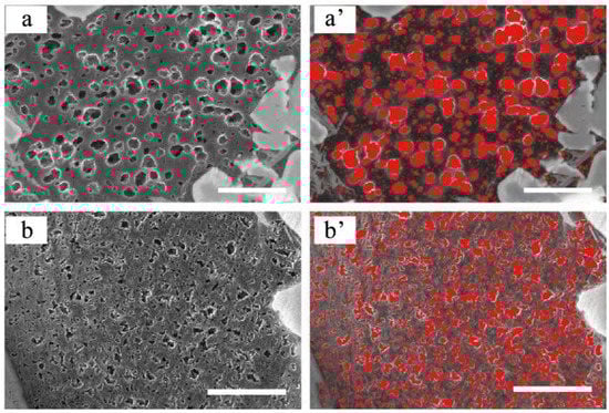 SEM images utilized for calculation of pores associated with organic matter in shales from the WF-LMX Formation. The left graph is the original SEM for the (a) WF Formation and (b) LMX Formation, and the right graph is the software to delineate the pore image for the (a’) WF Formation and (b’) LMX Formation, respectively.