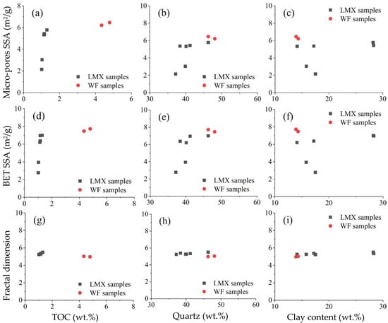 Relationships between shale pore structure parameters and TOC (a,d,g), quartz (b,e,h), and clay minerals (c,f,i).
