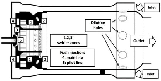 Regarding the can-type combustors, Meziane et al. studied an RQL type by CFD analysis for different hydrogen/methane mixture compositions [9], while Shih et al. reported the variations on the combustion process when there is different hydrogen content mixed with methane. Their findings demonstrated acceptable performance of the combustion process at moderate hydrogen fractions, up to 50% [10].