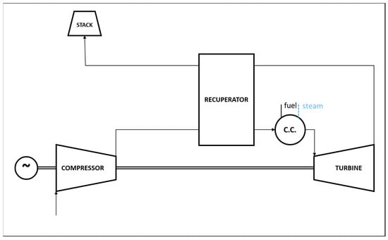 The system layout is shown in Figure 2. The difference between the commercial Turbec T100P and the proposed layout is solely related to the presence of steam injection in the combustor. The focus is on the effects of steam injection on the combustion process; so, the only difference between the original and the proposed layout regards this aspect, without any evaluation on how this small quantity of steam can be obtained.