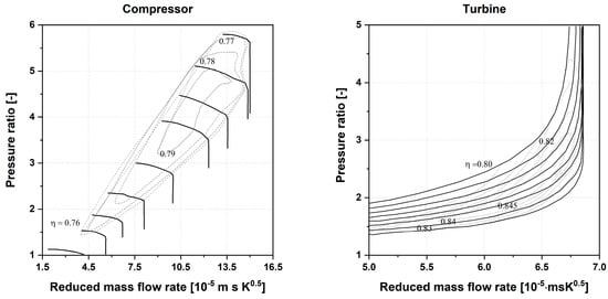 The introduction of rotating component operating maps (Figure 3) is required to take into account the part load and off-design conditions, also in the case of addition of steam inside the combustion chamber. Small variations in the gas mass flows at the turbine inlet can lead to different turbine operating points and, consequently, to different matching conditions between the compressor and the turbine.
