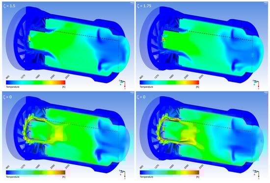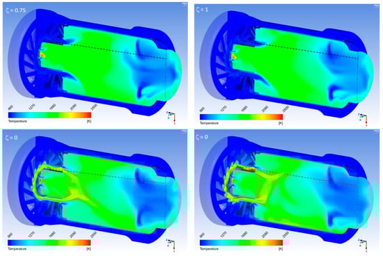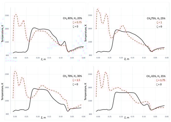 The different combustion behavior can be clearly displayed by showing the temperature distribution along an axial line of the combustion chamber, from one of the main swirler conduits. Figure 7 reports the temperature profiles along the dashed lines in Figure 5 and Figure 6. Solid black lines represent the profiles without steam addition.