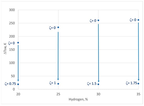 At 20% of hydrogen mixed with methane, the minimum value of is 0.75, while at 35% of hydrogen this value rises up to 1.75. As indicated above, the upper limit of the fuel and steam mass flow requires operating under lower load conditions, in the case of high levels of , for a percentage of hydrogen equal to or above 30% by volume (cases 3c and 4c in Table 2 and Table 3). In these cases, a higher value of does not correspond to a higher value of fuel and steam mass flow.