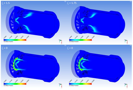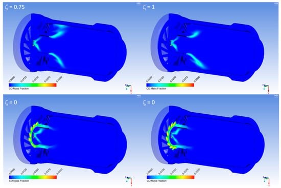 Figure 9 and Figure 10 display CO mass fraction profiles. In the absence of steam injection, at , the production of CO starts in the swirler conduits, revealing the occurrence of flashback. In the other cases, the CO mass fraction increases only in correspondence with the pilot flame and in the inner zone of the combustor, just after the swirler conduits.