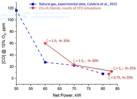 Figure 11 compares the results of the numerical simulations with the literature, for the same starting MGT (Turbec T100) under similar load conditions, in the case of natural gas feeding. CO emissions, in ppm, are evaluated at 15% of O2. The solid red line represents what is shown in Table 4, with respect to flashback-free operating conditions. The blue dashed line with square points shows the experimental values of CO emissions in the case of the natural gas fueled T100 [15].