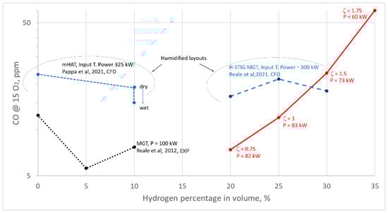 Figure 12 reports a comparison, in terms of CO emissions, of results of numerical simulations with results of CFD studies and experimental data for different methane–hydrogen blends. The blue dashed lines show the numerical results of two studies on humidified cycles, a HAT [26] and a H-STIG [27] under similar thermal input in power levels. The dashed black line shows experimental data for methane–hydrogen blends at full load (100 kW). These experiments were taken at different ambient temperatures [20].
