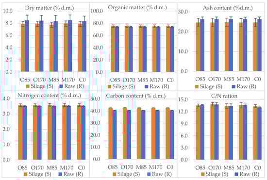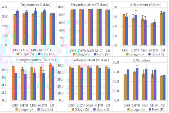 Characteristics of silage and raw material of Helianthus salicifolius used for the preparation of feedstock. (C0—without fertilization; M85—mineral fertilization 85 kg N ha−1; M170—mineral fertilization 170 kg N ha−1; O85—organic fertilization 85 kg N ha−1; O170—organic fertilization 170 kg N ha−1).