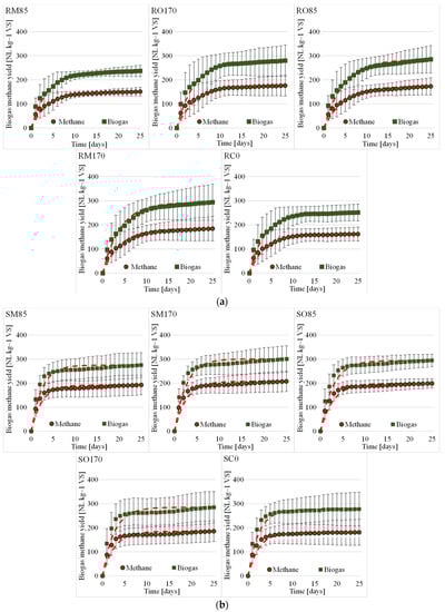 Respirometers with sludge and substrate were flushed with compressed (N2) nitrogen in order to ensure anaerobic conditions inside. The content was mixed at 100 rpm for 30 s every 10 min as the reactors were equipped with automated stirrers, a temperature control, and a stabilizing system. The volume of biomethane generated in the reactors was detected every 3 h during the measurements. Using the bioprocess control software, a gas production report was recorded every day, in already normalized data (standard atmospheric pressure 101.3 kPa, 0 °C and zero moisture content). The endogenous biogas by AS was excluded from the calculations of biomethane production in the tests. Biomethane yields were calculated once a day as the biomethane volume produced over a period of 25 days and expressed as NL kg−1 VS. At the end of the process, an aliquot of the remaining biogas in the headspace of the reactors was used to analyze the composition of biogas according to the methodology.