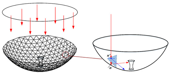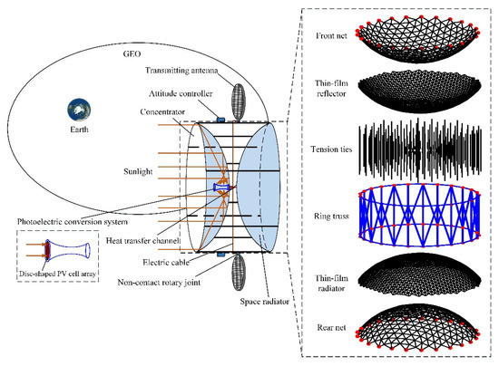 The two-layer thin-film surface is composed of two groups of triangular facets, one group forms the concentrator with a front net, called the top layer, and the other group forms the space radiator with a rear net, called the bottom layer, and both groups are shaped through the pretension of cable networks structure. The triangular facets at the top and bottom layers are made of thin-film materials with high reflectivity and high emissivity, respectively, for solar energy collection and waste heat radiation. The top layer concentrator concentrated several times solar energy on a photoelectric conversion system, which may lead to a serious thermal problem. Therefore, the bottom layer space radiator is used to dissipate the waste heat, transferred from the photoelectric conversion system through the heat transfer channel, to the cold space by heat radiation. The heat transfer channel adopts a multi-functional integrated design to provide support for the photoelectric conversion system while transferring heat out. In addition, the shape of the bottom layer satisfying the thermal control condition can be obtained through a form-finding design based on ensuring the accuracy of the top layer [27,28,29].
