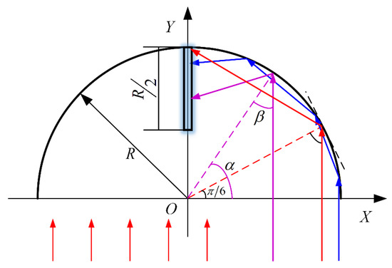 Equation (3) exhibits some concentrating characteristics of spherical concentrator that all incident sunlight will be converged within the region of [R/2, R] of Y-axis, which is described as linear concentrating mode. In addition, when the residual angle of incident sunlight belongs to the interval [π/6, π/2], it will be concentrated on Y-axis after one-time reflection, while the residual angle of incident sunlight belongs to the interval [0, π/6), it will be concentrated on Y-axis after multiple-time reflection. Thus, the region of [π/6, π/2] is named a one-time reflection region.