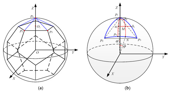 As shown in Figure 3a, the center O1 of a regular pentagon surface in the regular dodecahedron is firstly obtained, and the straight line OO1 is made and intersects the sphere at point p1, connecting p1 with other vertices of the regular pentagon to form five isosceles triangles, as shown in Figure 3a. Then, the triangle is projected to the sphere with radius length Op1 to form spherical isosceles triangles, as shown in Figure 3b. All three sides of the spherical triangle are geodesic arcs. In this way, the spherical triangle grid can be divided first, and then the coordinate of the entire spherical grid can be obtained by rotation and symmetry operation on the basis of the coordinate of the spherical triangle grid.