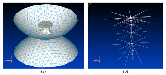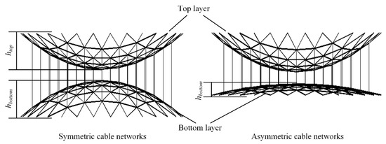 After the construction of the top layer, the bottom layer space radiator could be constructed using symmetric or asymmetric cable networks [29], as shown in Figure 5. The grid of the bottom layer is consistent with the top layer, and the grid points are one to one.
