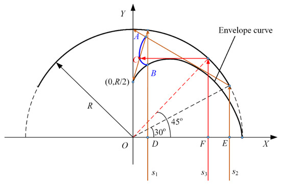 Suppose an incident ray s1 intersecting the X-axis at point D intersects the envelope curve at point B, then all incident sunlight from the OD region will be blocked, so the abscissa value of point B determines the self-blocking by the photoelectric conversion system. Another incident light s2 at the edge of the concentrator with an incident angle of π/3 will intersect the Y-axis at point (0, R), and its reflection intersects the reflection of s1 at A point. As known from the concentrating characteristic of the concentrator, all incident sunlight from the DE region will be concentrated on the curve AB.