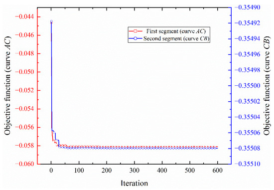 In order to avoid the impact of the initial value on the optimization procedure and the difficulties caused by the sensitivity solution, Particle Swarm Optimization (PSO) is used to obtain an optimal solution based on the mathematical optimization model established above. To reduce the calculation scale, a concentrator model with R equal to 0.5 m is used for the optimization procedure. Generations are set to 600 and the size of the population is set to 20. The order of curves CB and AC are 2 and 3, respectively, and the number of subsections of curves CB and AC is 3 and 6, respectively. The number of sampled sunlight is set to 105 after sensitivity analysis. The pre-given value [ηs] is set to 0.05, and the weighting factors are set to ω1 = ω2 = 0.5.