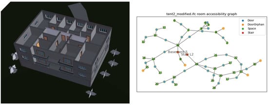 An accessibility graph is used to encode relations among spaces in the building. Adjacent graphs are commonly used in different kinds of analysis of spatial layouts, e.g., using the space syntax theory [25]. In architecture, this is often done to analyze the layout, connectedness, and relations between the spaces of the building. Another application of accessibility graphs is the automated calculation of emergency exit pathways; the maximum distance from each room to a fire-safe room is regulated by the Austrian building code (https://www.oib.or.at/de/oib-richtlinien/richtlinien/2019/oib-richtlinie-2, accessed on 15 January 2022). Using the accessibility graph, the shortest route to reach a fire-safe place can be easily calculated utilizing standard graph algorithms (for example, implemented in the networkx python package [26]). Adding length measures to the space-graph edges (distance between rooms), the path length can be obtained in meters.