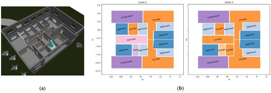 (a) An IFC model visualized with BIMVision software (https://bimvision.eu/, accessed on 15 January 2022); (b) The output of our WGCN space classifier for the spaces on the two floors of the building model.