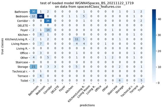 Figure 5 shows the confusion matrix for the inductive inference test. Some prediction errors are understandable; for example, the network often mistakes Corridors for Foyers (14 times). The IfcSanitaryTerminal elements (used to represent elements such as drains, water closets, or sinks) were not used as space features, as around half of the used models did not contain such elements. Without this feature, it was hard for the model to differentiate between bathrooms and storage rooms (21 cases).