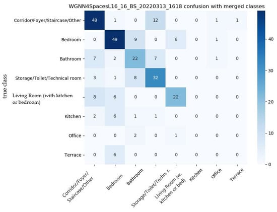 The relatively low classification accuracy stemmed from the high number of room-types—some of them having just a few examples in the training set. Some room-types are hard to differentiate without additional information (like Storage rooms vs. Toilets); we also see that Foyers and Corridors are often confused by the neural model. They have a similar room function, although the difference is only that Foyers are within the apartments. Therefore, it made sense to merge some room types and recalculate both the confusion matrix and accuracy. We grouped the following room types to create the following three aggregate classes:
