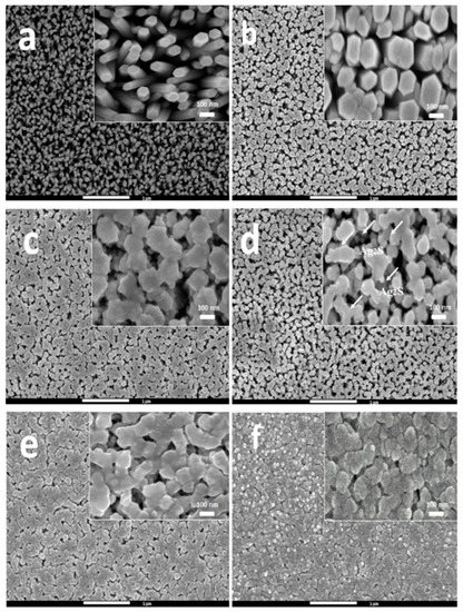 It is well known that increasing or decreasing the concentration of reactants will ultimately influence the resulting film. This implies that good control over the electrolyte composition can be employed to improve direct control over the final thin film. Figure 1 shows the Ag2S film morphology with a variation of the concentration of silver nitrate at a constant concentration of thiourea (0.03 M), with insets showing magnified top-view images for each sample. It can be noticed from Figure 1b that at a low concentration of 0.001 M of AgNO3 with a high concentration of thiourea 0.03 M, the surface morphology displayed increasing diameter of the rods without any nanoparticles of Ag2S, which explained the XRD result presented in Figure 2. Meanwhile, Ag2S nanoparticles were successfully deposited on the surface of ZnO nanorods at a concentration of 0.003 M and a higher concentration of 0.005 M, with no noticeable change in the surface morphology of the two concentrations. The resulting films were homogenous and almost completely covered the whole surface of the ZnO NRs. However, as can be observed in Figure 1e–f, increasing the concentration of AgNO3 caused agglomeration of Ag2S nanoparticles; subsequently, at high concentrations (0.008 M and 0.01 M) of AgNO3, the rods merged due to the agglomeration of Ag2S to form a continuous nanocomposite film. Furthermore, Figure 1f shows the presence of white spots on the surface. The spots are due to Ag protrusions which occurred spontaneously because of exposure to the electron beam. This phenomenon only occurred at a high concentration of AgNO3 and was noted by Morales Masis (2012) [45].
