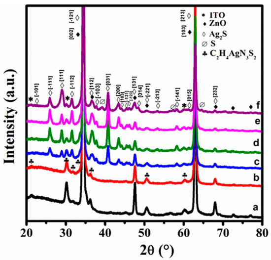 X-ray diffractogram of ZnO NRs (a), Ag2S/ZnO NRs/ITO with various concentrations of CS(NH2)2: (b) 0.01 M; (c) 0.03 M; (d) 0.05 M; (e) 0.08 M; and (f) 0.1 M.