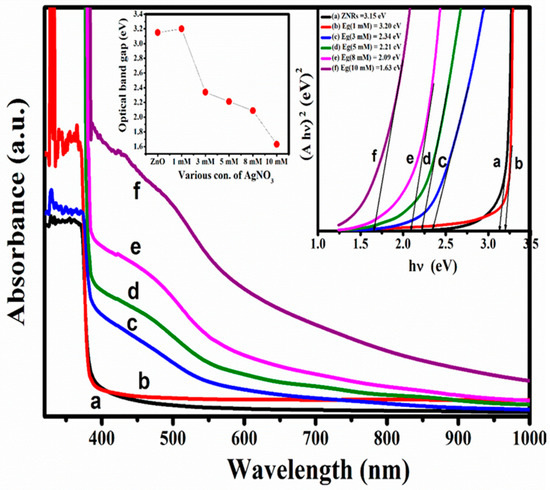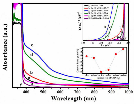 The UV-vis spectra and the observed bandgap values of deposited Ag2S/ZnO nanocomposite for samples prepared at different concentrations of CS(NH2)2 are given in Figure 7. The bandgap values of the sample prepared under concentrations of 0.01 M to 0.05 M lie in the range of 3.05 to 2.04 eV, indicating that they are shifted from a blue to red region when Ag2S was formed, which was also confirmed from the XRD results and FESEM. It is seen in insets Figure 7b,c that the value of the bandgap for the Ag2S/ZnO nanocomposite decreased with the increased concentration of thiourea. An above a concentration of 0.05 M which led to the low amount of Ag2S was created due to the precipitation effect as described earlier. Thus, bandgap values remain high close to the value of ZnO.