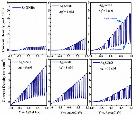 Under illumination, ZnO absorbs UV light and Ag2S absorbs visible light. The electrons and holes are generated in both ZnO and Ag2S. The photoexcited electrons from Ag2S will move to ZnO due to the lower conduction band (CB) of ZnO. Meanwhile, the holes of ZnO will migrate to Ag2S because of the higher valence band (VB) of Ag2S. The photoexcited electrons in ZnO move to ITO glass, then to the external wire, where they will be reduced at the counter electrode. On the surface/electrolyte, the photoexcited holes in Ag2S can oxidize. The photoexcited electron–hole pairs are effectively suppressed in this scenario, and the charge carrier lifetime in the ZnO/Ag2S heterostructure is extended. As a result, the photo response of Ag2/ZnO NRs is superior to pure ZnO. The amount of deposited Ag2S influences the photoelectrochemical properties of Ag2S NPs/ZnO NRs. PEC data (Figure 8) displayed only three photoelectrodes with the dark current, which is indicative of the presence of Ag2S/ZnO nanocomposite. Therefore, the optimal deposition and concentration for thiourea are important factors affecting the photoelectrochemical properties of Ag2S/ZnO NRs. The highest photocurrent was obtained for a thiourea concentration of 0.03 M.