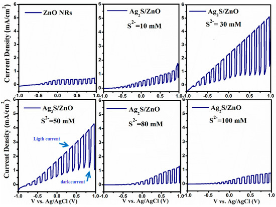 Linear sweep voltammograms from −1.0 to 1.0 V at a scan rate of 20 mV s-1 for ZnO NRs/ITO and Ag2S/ZnO NRs/ITO formed at various CS(NH2)2 concentrations.
