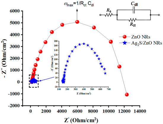 The EIS analysis of photoelectrodes was performed to better explain the kinetics of the electrochemical and PEC processes occurring in the photoelectrodes. The photoelectrochemical EIS measurements were performed using a mixture of Na2S and Na2SO3 electrolyte. The Nyquist plot for the PEC performance of ZnO NRs and Ag2S/ZnO NRs at optimum conditions (0.005 M AgNO3 and 0.03 M CS(NH2)2) is shown in Figure 9. The Nyquist plot is used to measure the conductivity and charge transfer resistance [48]. It provides the qualitative insight of the charge transfer processes in bulk as well as at the interface of photoanode. From Figure 9, the arc diameter of Ag2S/ZnO NRs at optimum conditions (0.005 M AgNO3 and 0.03 M CS(NH2)2) was smaller compared to the unmodified ZnO NRs photoanode, indicating the reduction in the resistance on the transport of charge. The Randle equivalent circuit contained the resistance of the solution (Rs) related to the bulk properties of the electrolyte, the double-layer capacitance (Cdl), and the charge transfer resistance (Rct) [49]. The last two are related to the surface properties of the interface between the electrode and the solution, and the fitting parameters are tabulated in Table 3. Accordingly, Rct was 12 × 103 and 673 Ω. cm2 for pristine ZnO NRs and Ag2S/ZnO NRs, respectively. The smallest Rct of Ag2S/ZnO NRs indicated higher conductivity and faster charge transformation at the interface on Ag2S/ZnO NRs. This variation in Rct values strongly supports PEC performance measurements [50]. Additionally, the different values of Cdl were attributed to the higher interface between Ag2S/ZnO NRs and the electrolyte than that of pure ZnO NRs.