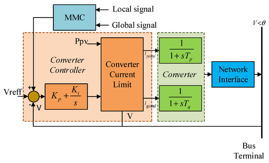 The North American Electric Reliability Corporation (NERC) and Western American Electricity Coordination Council (WECC) developed a model of transmission-level PV that is suitable for stability studies in the electromechanical timeframe [23]. The dynamic model of the PV plant developed by NERC and WECC was later adopted in several state-of-the-art power system simulation environments, and consists of the converter and associated controllers [24,25]. The converter is represented by a set of first-order transfer function models [24]. The converter controller consists of PI controllers and current limiters. The dynamics associated with the DC link capacitor are not considered in this model due to the faster time step of the DC link compared to the electromechanical timeframe. The dynamics associated with the maximal power tracking are also ignored in this model due to the different time steps compared to the electromechanical oscillation. Moreover, the PV system was assumed to be operated around the maximal power point [23]. Figure 1 shows the dynamic model of a PV plant with a multimodal controller (considered in this paper). Detailed model and mathematical representation of PV plant dynamic model are presented in [26]. The PV’s active power and voltage control are represented in (13) and (14).