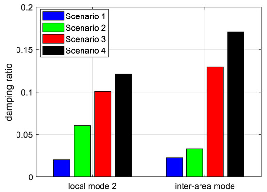 The impact of penetration levels of RESs on the power system’s oscillatory stability was investigated next. The penetration levels of RESs varied from 6% to 50% of the total system generation. The damping ratio was used to estimate how many RESs can be integrated into the Javan power system from a small-signal stability point of view. Table 4 and Table 5 illustrate the comparison of the damping of interarea and local mode 2 variation due to the increasing penetration of RESs under different scenarios.